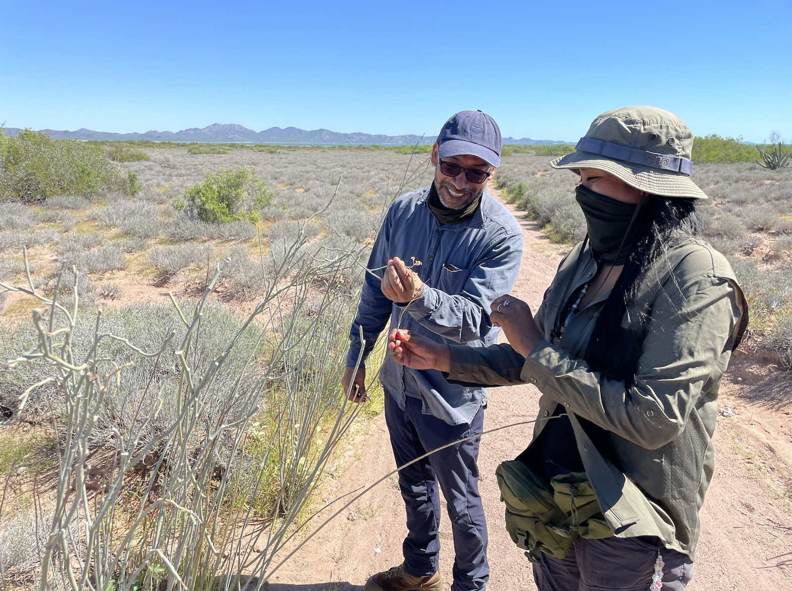 Los biólogos Dulce Troncoso y Vladimir Rojas, durante los talleres sobre polinizadores con los monitores comunitarios comcáac. Foto: cortesía Arantxa Peralta García / IBUNAM – CCC para Mongabay Latam.