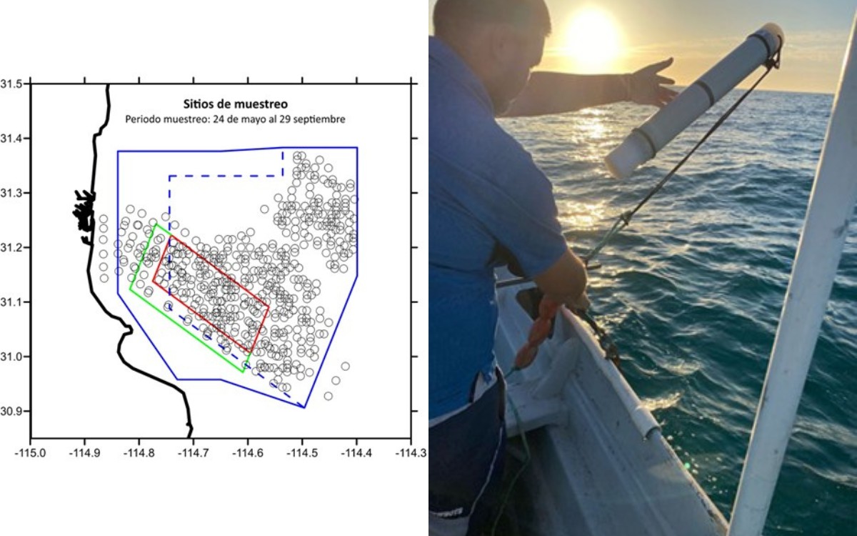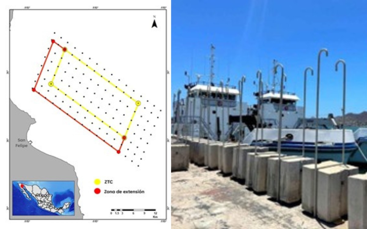 Figura 5. Mapa con los sitios de muestreo donde se colocaron con anclajes los detectores acústicos del 24 de mayo al 29 de septiembre de 2025. El polígono azul es el Refugio de Vaquita, el polígono rojo es la ZTC y el polígono verde es la AE. La imagen de la derecha muestra a un pescador lanzado un detector acústico.