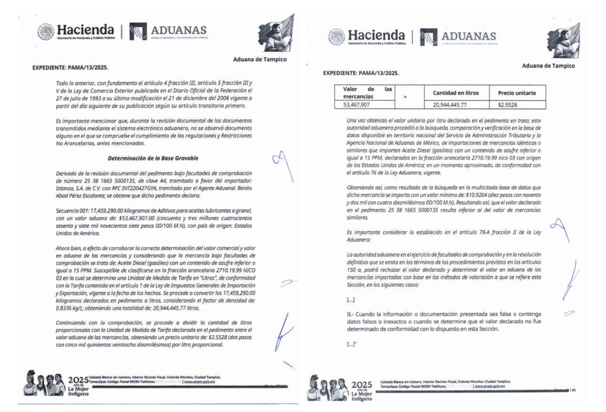 El expediente, al que MCCI tuvo acceso, menciona que a efecto de corroborar la correcta determinación del valor de la mercancía que transportaban las pipas revisadas, se determinó que se trataba de aceite diésel y no de aditivos, como se declaró ante aduanas.