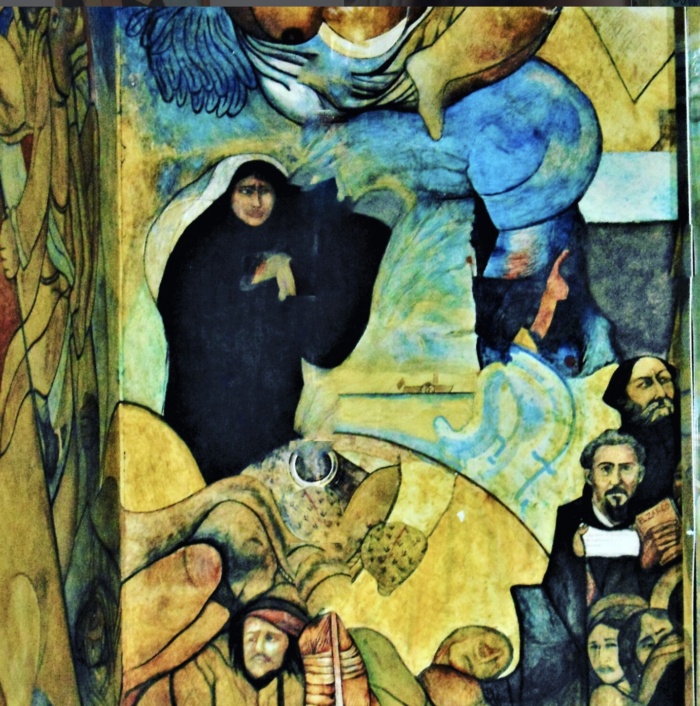Un experto de la pintura al fresco, realizada -en muchas ocasiones- con una caña de bambú de más de 10 metros o trepado en un andamio en las alturas, Peredo creó en 2018 seis murales portátiles, donde plasmó el “fenómeno histórico y sociológico” que representó el arribo de los españoles a América.