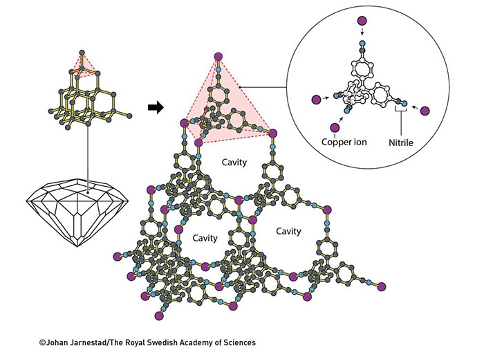 El punto de partida de esta revolución química se remonta a 1989, cuando Richard Robson realizó un experimento pionero: combinó iones de cobre con carga positiva con una molécula de cuatro brazos, cada uno con un grupo químico atraído por el cobre. El resultado fue un cristal espacioso y bien ordenado, como un diamante lleno de innumerables cavidades. Aunque la estructura era inestable, Robson vislumbró su potencial.