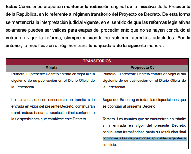 “Estas comisiones proponen mantener la redacción original de la iniciativa de la presidenta de la República, en lo referente al régimen transitorio del proyecto de decreto. De esta forma, se mantendría la interpretación judicial vigente, en el sentido de que las reformas legislativas solo pueden ser válidas para las etapas del procedimiento que no se hayan concluido al entrar en vigor la reforma, siempre y cuando no vulneren derechos adquiridos”.