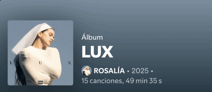 Rosalía lanzó el viernes ‘Lux‘, que en digital está compuesto por 15 canciones y 18 en su formato físico, trabajo ante el que se han rendido medios como la revista Rolling Stone, la BBC, The Guardian o Variety.