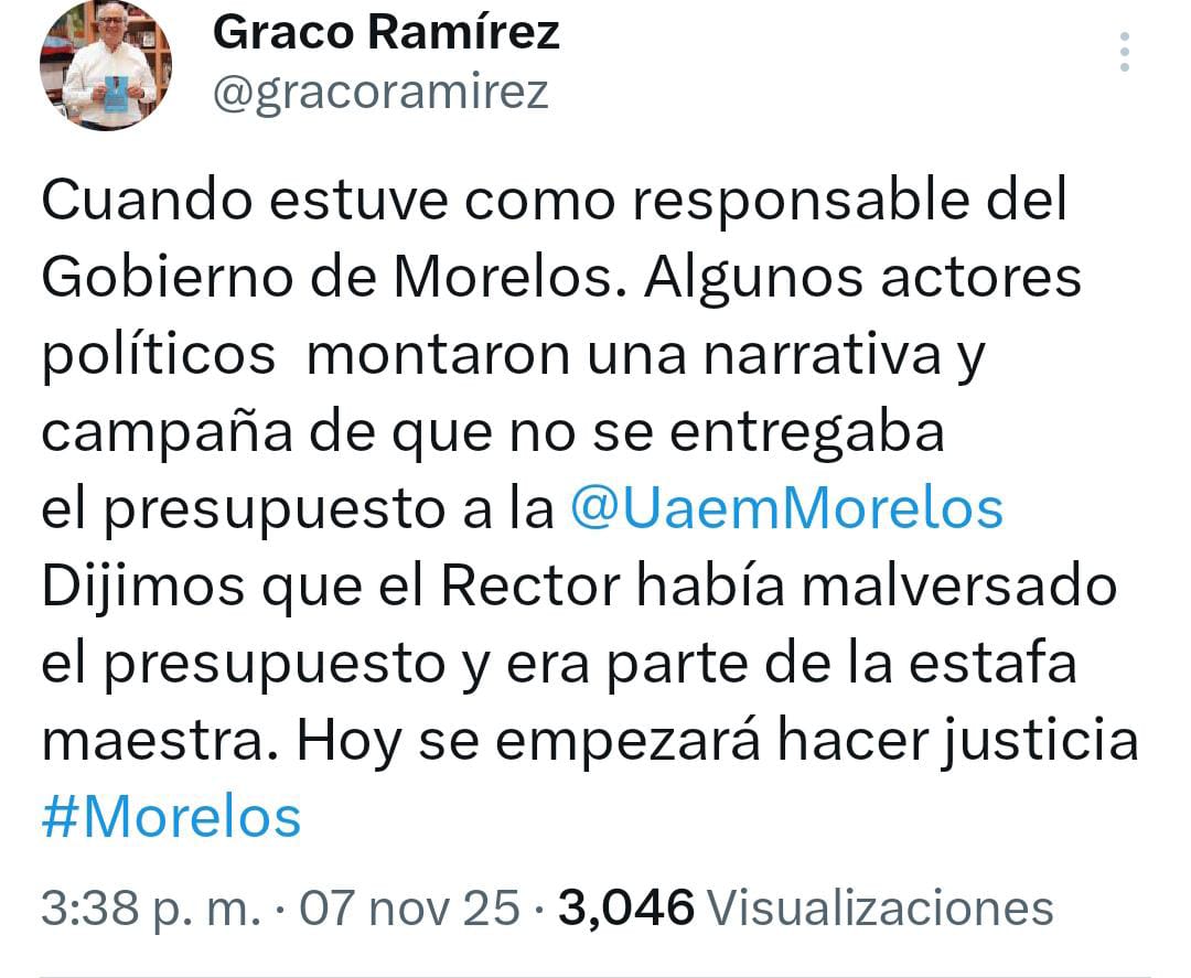 Previo a la difusión del documento, el exgobernador Graco Ramírez celebró públicamente la detención del exrector. En un mensaje en su cuenta de la red social X, recordó que durante su administración (2012–2018) se denunciaron presuntas irregularidades financieras en la UAEM, relacionadas con la llamada “Estafa Maestra”, y afirmó: “Hoy se empezará a hacer justicia”.