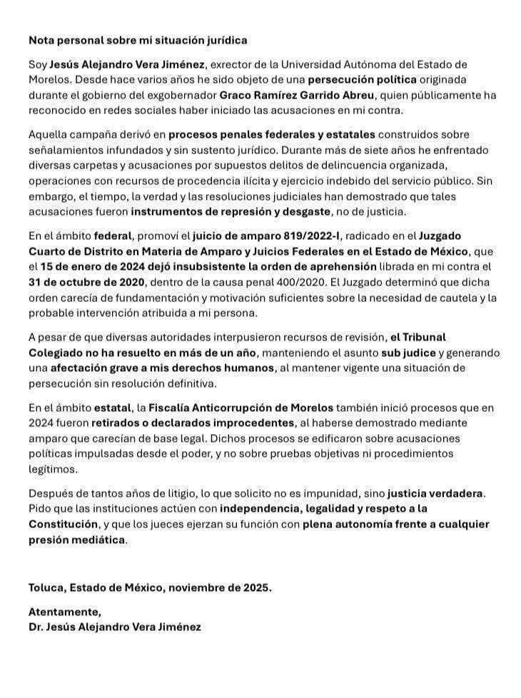Desde el penal federal del Altiplano, el exrector de la Universidad Autónoma del Estado de Morelos (UAEM), Jesús Alejandro Vera Jiménez, difundió una carta en la que acusa al exgobernador Graco Ramírez Garrido Abreu de ser el responsable de su detención y de haber iniciado una persecución política en su contra durante su administración.