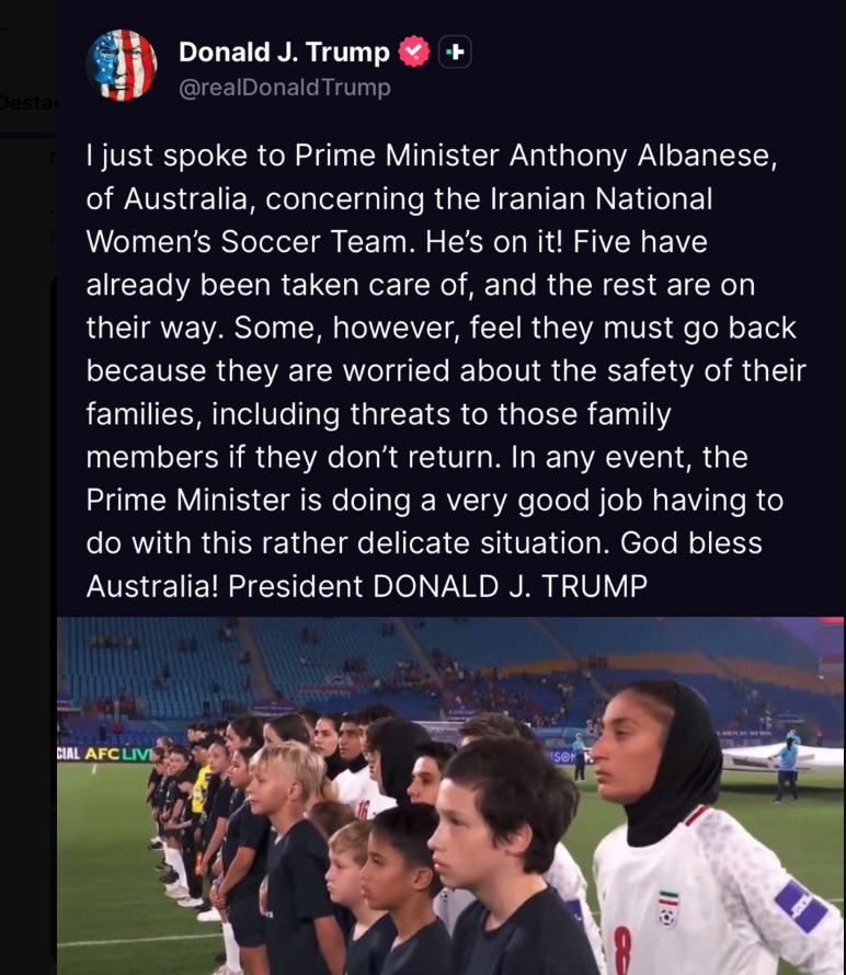 “Australia está cometiendo un terrible error humanitario al permitir que obliguen a la selección nacional femenina de futbol de Irán a regresar a Irán, donde muy probablemente serán asesinadas. No lo haga, señor primer ministro, concédales ASILO”, dijo Trump en un mensaje en su red Truth Social dirigido al primer ministro Anthony Albanese.