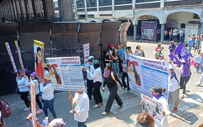 Encabezaba la marcha una manta morada con la leyenda: “Feminismo contra toda guerra”. Detrás, nombres e imágenes de víctimas de feminicidio, entre ellas Aylin Rodríguez, estudiante desaparecida y asesinada en 2025. Su madre, Karime Rodríguez, señaló que la investigación apenas registra avances: “No ha habido sentencia. No podemos pasar de una audiencia intermedia”.