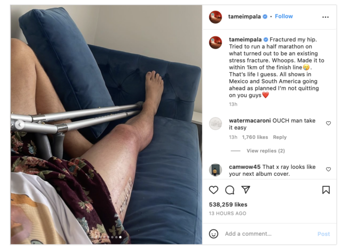 El músico australiano reveló que se fracturó la cadera luego de haber corrido un medio maratón.