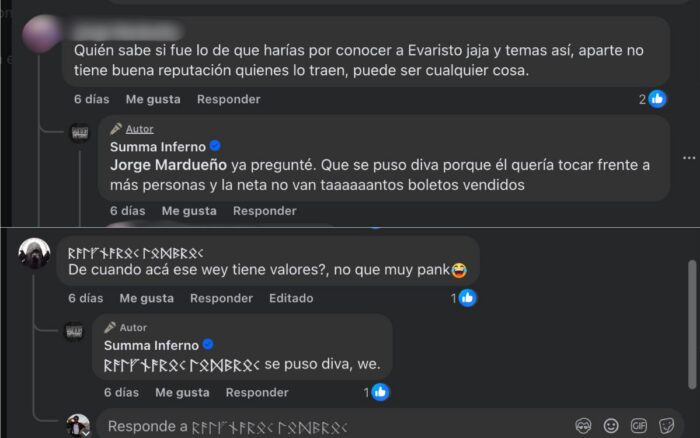 Con este mismo discurso la página Summa Inferno realizó comentarios con información engañosa, señalando que la cancelación se dio porque Evaristo quería tocar frente a mucha gente y llamándolo “diva”.