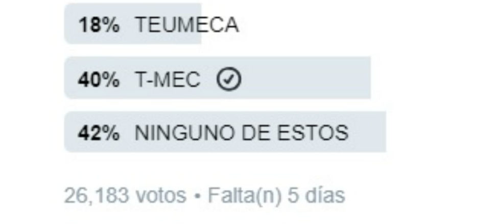 Hasta las 13:50 horas de este martes se habían registrado más de 25 mil votos en Twitter, con un 42% para ninguno de estos, un 40% para T-MEC y 18% para TEUMECA.