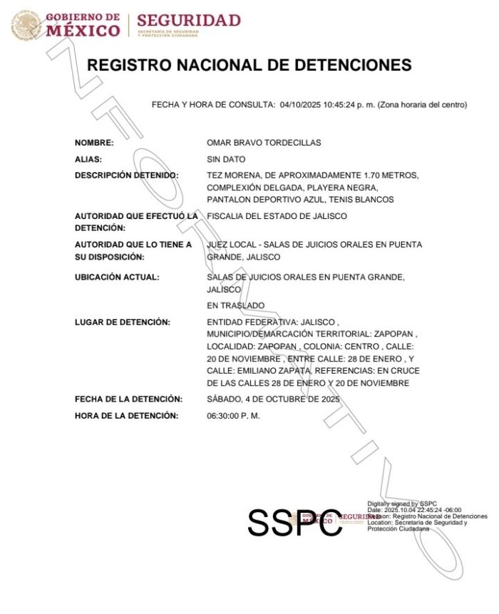 Bravo, de 45 años, fue capturado el sábado en un operativo en el centro de Zapopan, luego de una denuncia. Permanece en prisión preventiva oficiosa y recluido en el penal de Puente Grande a disposición del juez local.