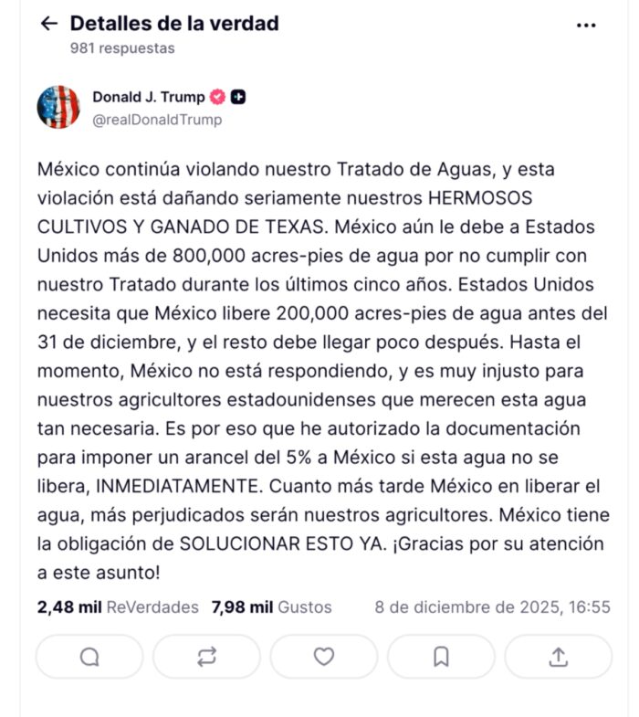 En una publicación de su cuenta en Truth Social, Trump agregó que México aún debe más de 986.4 millones de metros cúbicos de agua acumulados en los últimos cinco años y advirtió que mientras no se cumpla con el tratado, los agricultores estadounidenses continuarán sufriendo daños económicos.