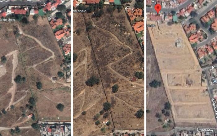 Imágenes correspondientes a 2020, 2024 y 2025 (una vez iniciadas las obras) del terreno donde se construye “Privada Lomas Verdes”. Imágenes: Google Earth