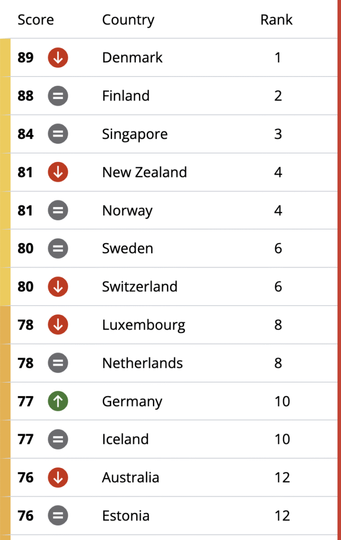 En contraste, Dinamarca (89), Finlandia (88) Singapúr (84), Nueva Zelanda (81), Noruega (81), Suecia (80), Suiza (80), Luxemburgo (78), Países Bajos (78) y Alemania (77) fueron los países mejor calificados.