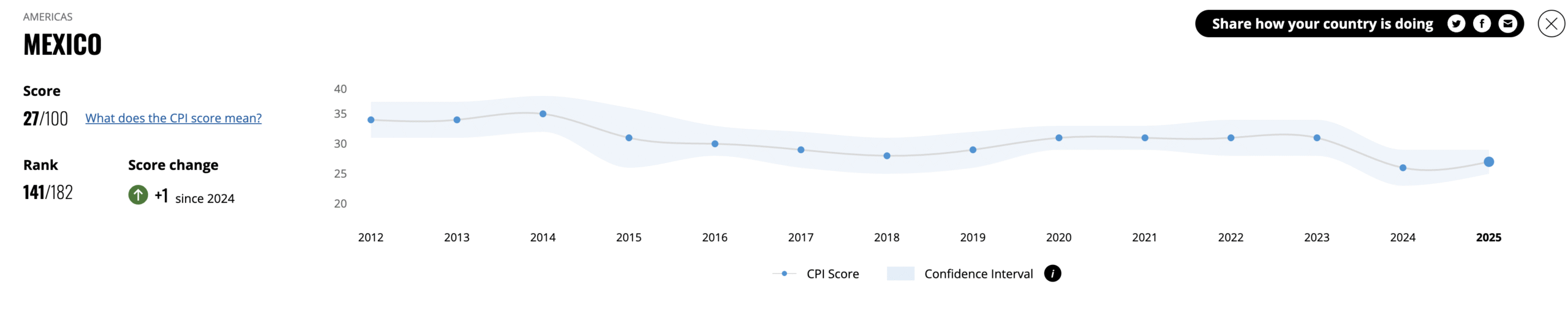 Partiendo de ese contexto, México marcó 27 puntos, su segunda calificación más baja desde 2012; desde ese año, la calificación máxima obtenida fue de 35 en 2014, desde entonces, ha fluctuado hasta bajar a los 26 puntos en 2024.