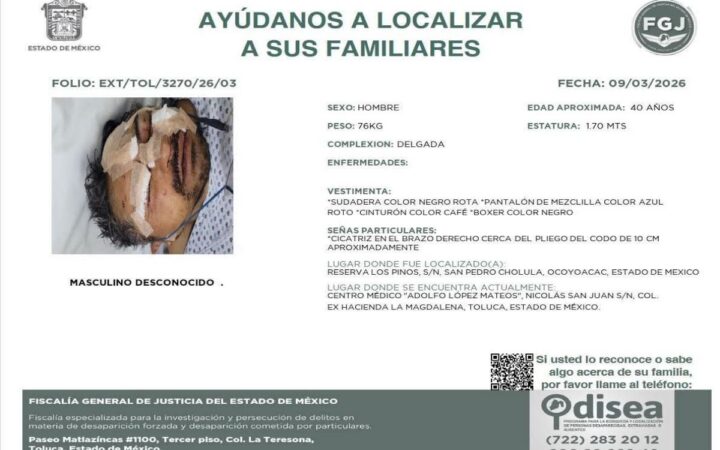 De acuerdo con la ficha con folio EXT/TOL/3270/26/03, emitida el 9 de marzo de 2026, se trata de un hombre de complexión delgada, aproximadamente 1.70 metros de estatura y 76 kilogramos de peso.