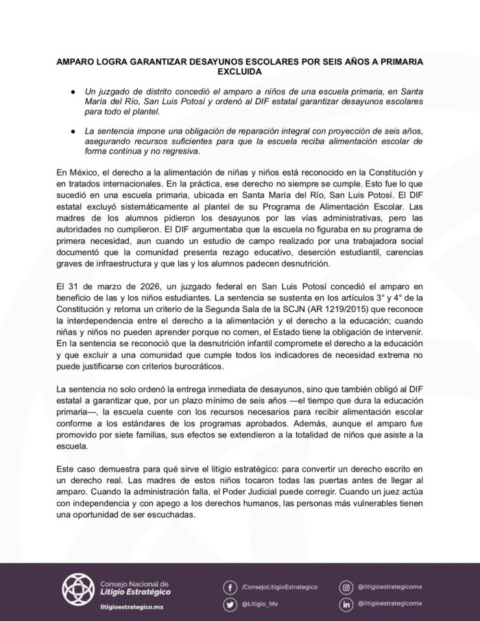 El caso, informa el Consejo Nacional de Litigio Estratégico en un comunicado, se originó luego de que el DIF estatal excluyera sistemáticamente al plantel de su Programa de Alimentación Escolar. De acuerdo con las autoridades administrativas, la escuela no figuraba en su esquema de “primera necesidad”. Lo anterior se sostuvo a pesar de que un estudio de campo elaborado por una trabajadora social documentó que los alumnos padecen desnutrición, y que la comunidad enfrenta graves carencias de infraestructura, rezago educativo y deserción estudiantil.