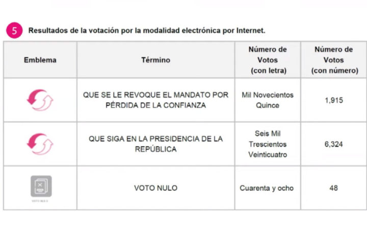 En total, se recibieron mil 915 votos para que se le revoque el mandato por pérdida de confianza y 6 mil 324 para que siga en la Presidencia de la República.