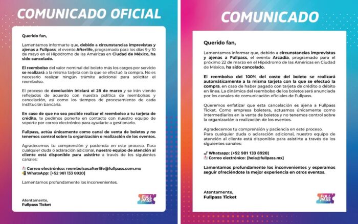 “Tanto yo como otros afectados dimos el tiempo de 30 a 60 días hábiles para el reembolso, pero no se vio ningún avance por parte de la boletera“, comparte en entrevista para Aristegui Noticias Francisco Lozano quien no solo espera su devolución por el fallido Aferlife, sino también por otro evento cancelado para el cual FullPass vendió boletos: Arcadia.