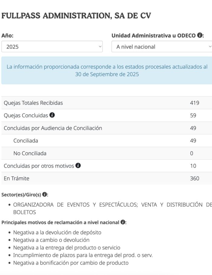 De acuerdo con el Buró Comercial de Profeco, FullPass Administration S.A. de C.V. tiene 419 quejas al corte del 30 de septiembre de 2025. De estas 59 se encuentran concluidas; 49 por conciliación y 10 por otros motivos, los cuales pueden ser quejas improcedentes, desistidas o canceladas. 360 se mantienen en trámite.