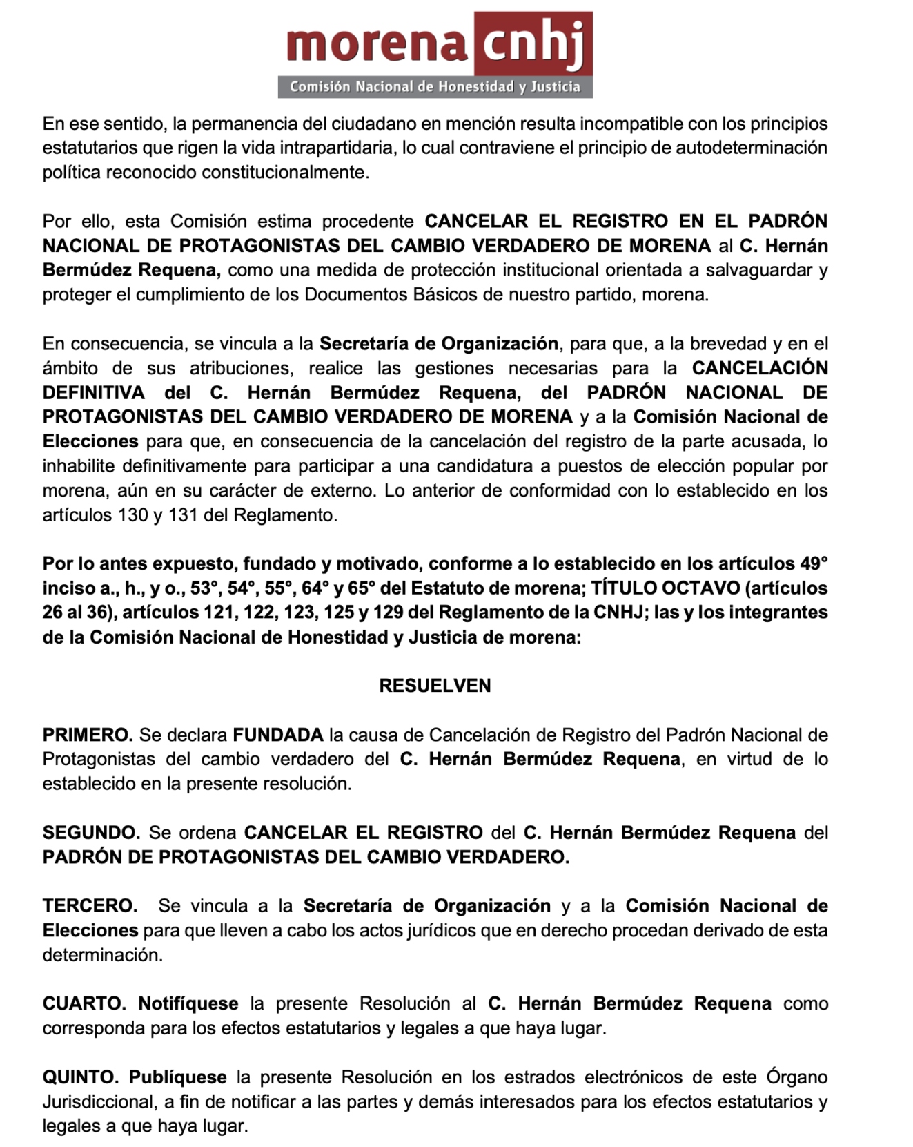 “Por ello, esta Comisión estima procedente CANCELAR EL REGISTRO EN EL PADRÓN NACIONAL DE PROTAGONISTAS DEL CAMBIO VERDADERO DE MORENA al C. HernánBermúdez Requena, como una medida de protección institucional orientada a salvaguardar y proteger el cumplimiento de los Documentos Básicos de nuestro partido, Morena”, concluye la resolución.
