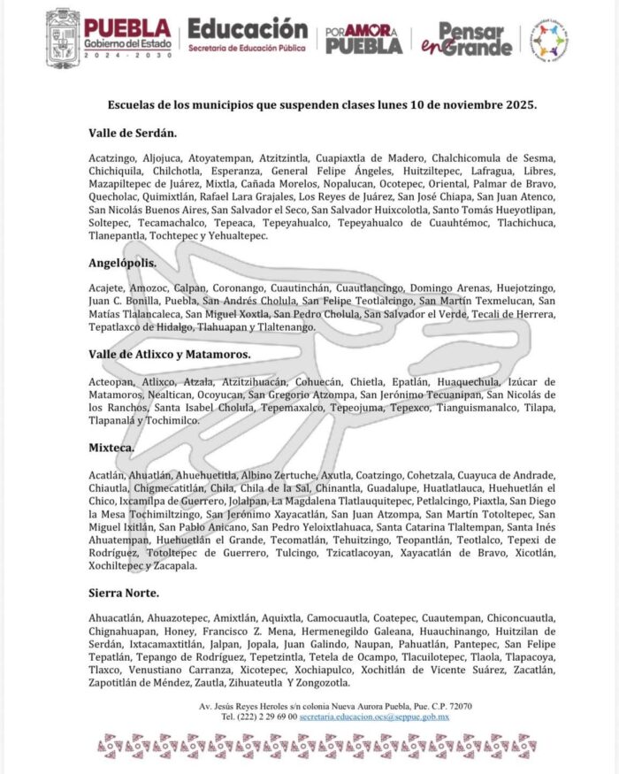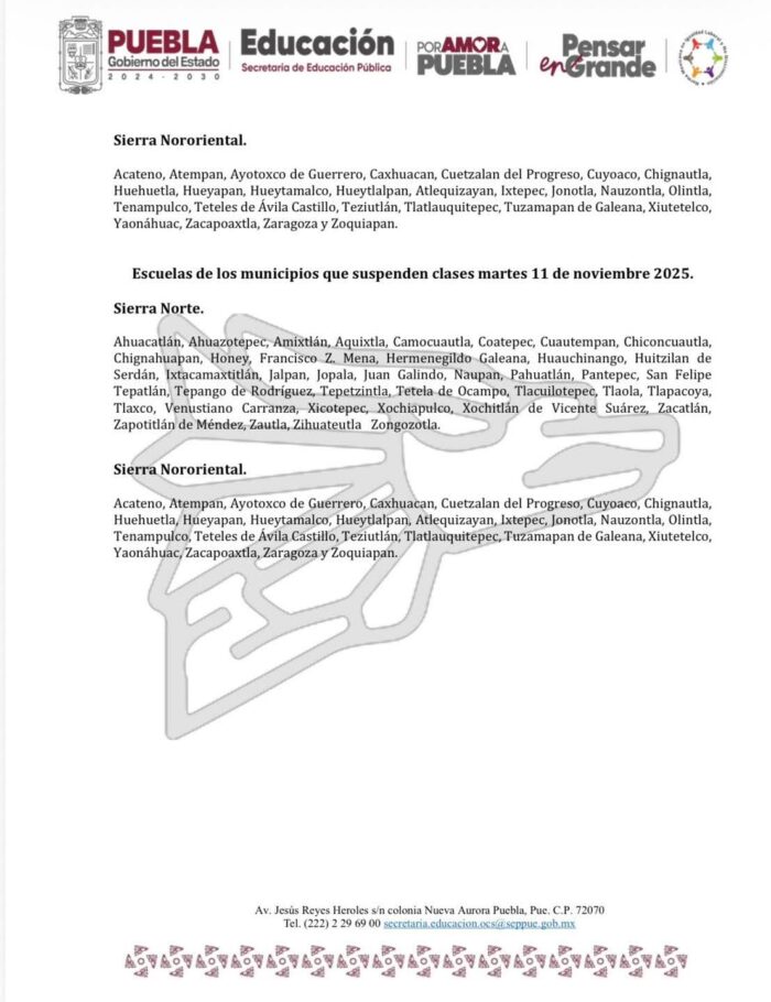 El comunicado agrega que “el martes 11 de noviembre continuarán en suspensión de clases escuelas de las sierras Norte y Nororiental, las clases serán reanudadas de manera presencial el miércoles 12 de noviembre, en el horario habitual”.