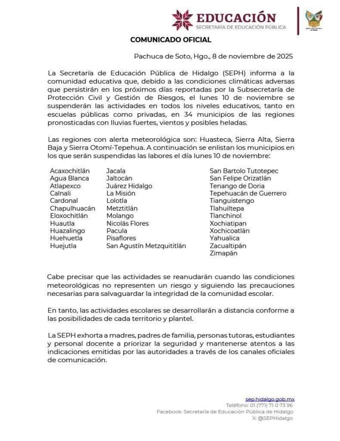 La Secretaría de Educación Pública de Hidalgo (SEPH) precisó que este lunes se suspendieron las actividades “en todos los niveles educativos, tanto en escuelas públicas como privadas, en 34 municipios de las regiones pronosticadas con lluvias fuertes, vientos y posibles heladas”.