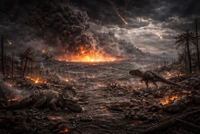 Por ejemplo, en aquellos días el cielo se oscureció durante meses (quizá años) lo que provocó el colapso de la fotosíntesis, la caída de la cadena alimentaria, un tremendo frío global y, por si fuera poco, también incendios y lluvia ácida.