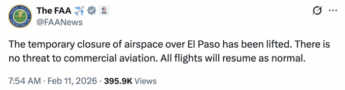 A las 7:54 de la mañana la FAA emitió un mensaje en sus redes sociales en la cual confirmó el levantamiento inmediato del cierre temporal del espacio aéreo sobre El Paso, Texas, originalmente programado para 10 días a partir del 10 de febrero de 2026, asegurando que no hay una amenaza continua para los vuelos comerciales.