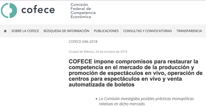 En 2015, la Comisión Federal de Competencia Económica (Cofece) inició una investigación contra Ticketmaster en México por prácticas monopólicas. Y tres años después, en 2018, desistió de la indagatoria bajo la promesa de que CIE (Corporación Interamericana de Entretenimiento), la empresa que opera la venta de boletos, OCESA y los principales recintos en México, corregiría sus prácticas en el mercado en el mercado de espectáculos mexicano.