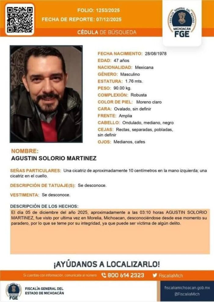 El hombre fue reportado como desaparecido en Morelia el 5 de diciembre de 2025, alrededor de las 03:10 horas.