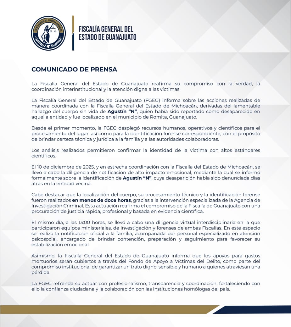 Además, la FGEG informó que los gastos mortuorios serán cubiertos a través del Fondo de Apoyo a Víctimas del Delito, como parte del compromiso institucional de garantizar un trato digno, sensible y humano a quienes atraviesan una pérdida.