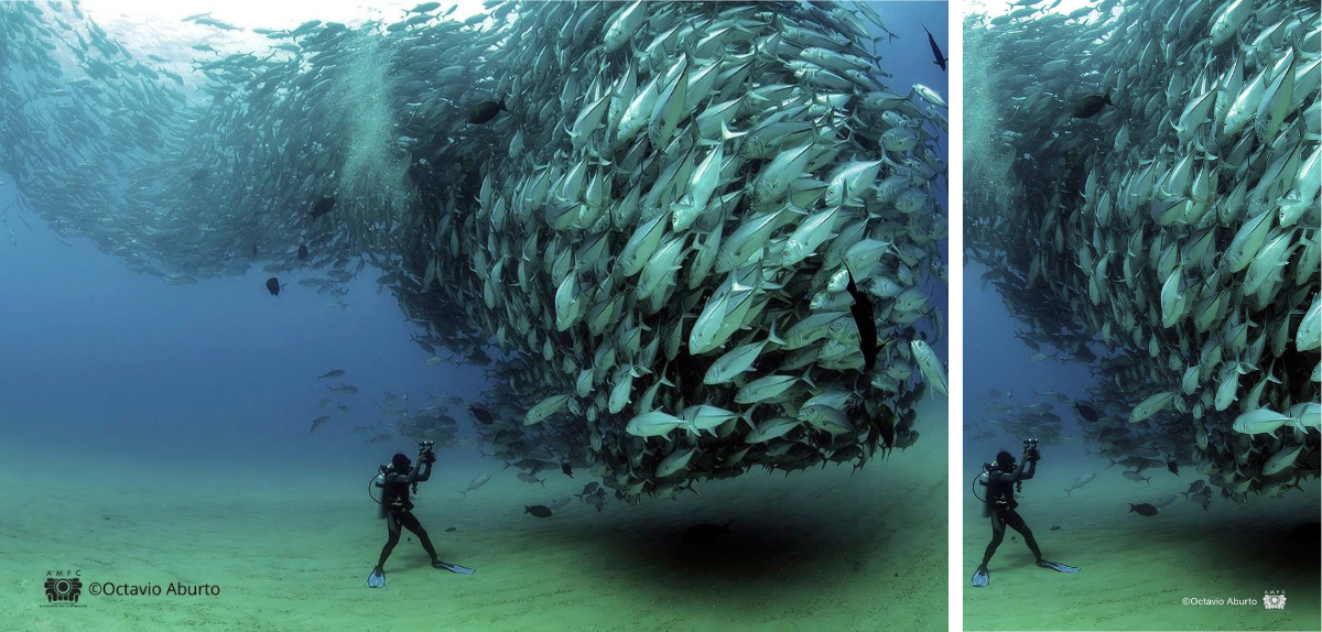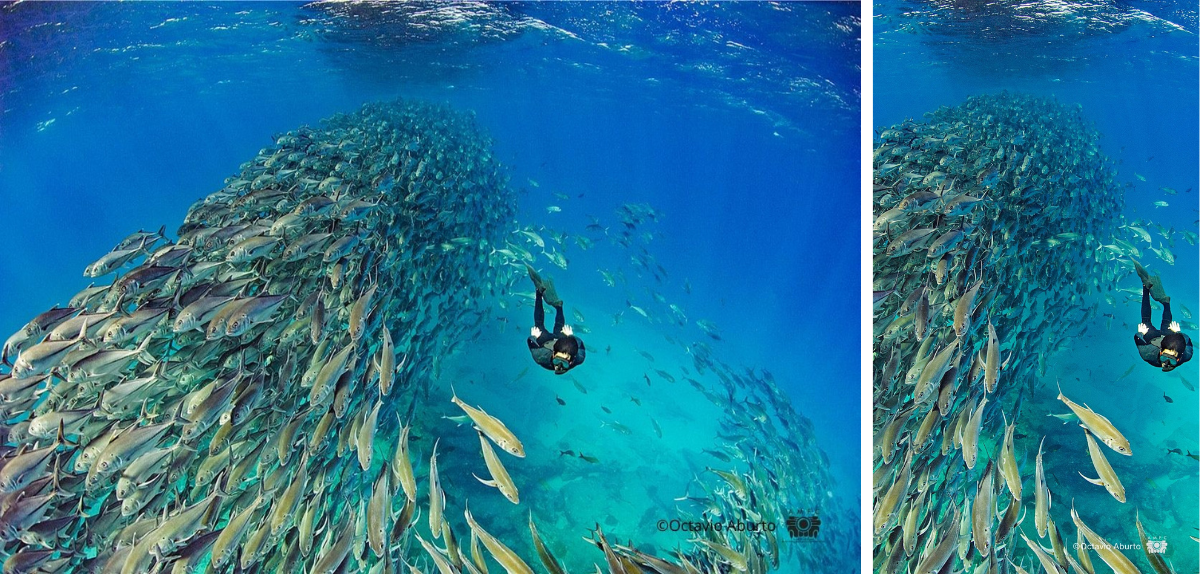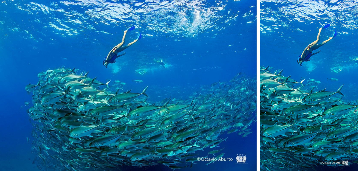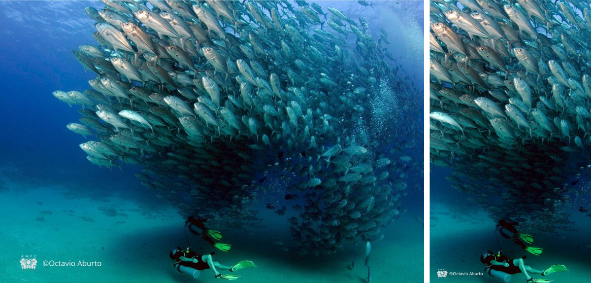 De ese proceso nació una imagen que ya forma parte del imaginario global: el gran cardumen de peces frente a un buzo, fotografiado por Octavio Aburto. La foto captura un instante que sintetiza una década de regeneración marina. Miles de peces se mueven al unísono formando una nube plateada mientras el buzo, diminuto, observa inmóvil.