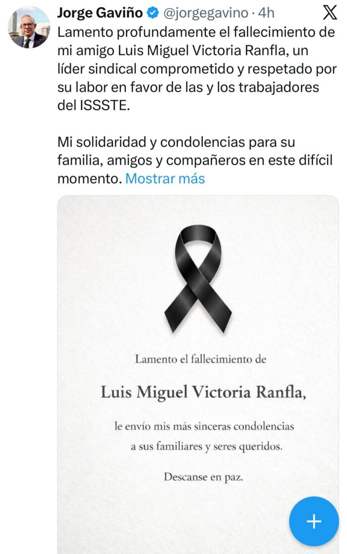 “Lamento profundamente el fallecimiento de mi amigo Luis Miguel Victoria Ranfla, un líder sindical comprometido y respetado por su labor en favor de las y los trabajadores del ISSSTE. Mi solidaridad y condolencias para su familia, amigos y compañeros en este difícil momento. Descanse en paz”.
