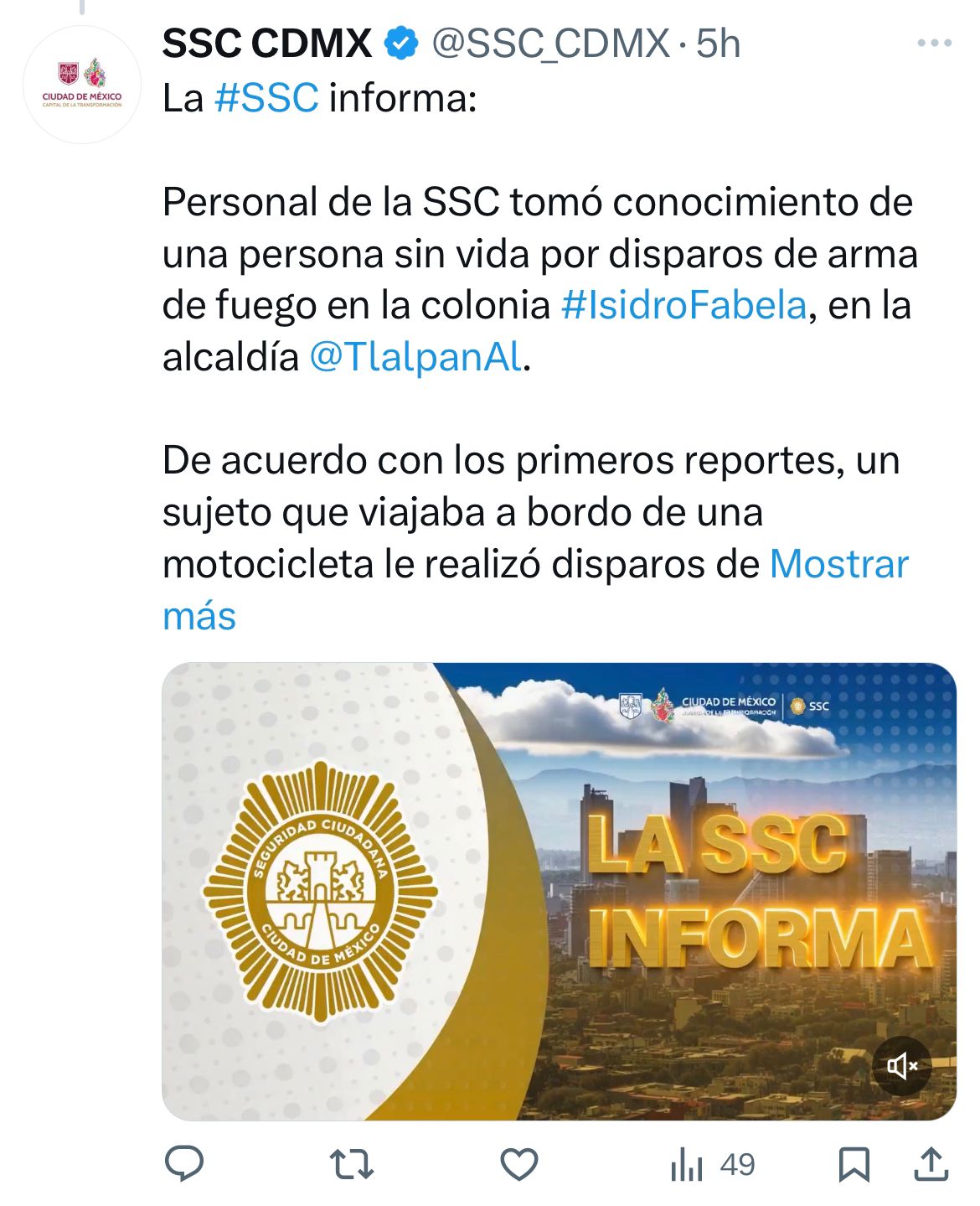 En una tarjeta informativa, la Secretaría de Seguridad Ciudadana (SSC) de la Ciudad de México informó que policías capitalinos tomaron conocimiento de una persona sin vida tras un ataque armado.