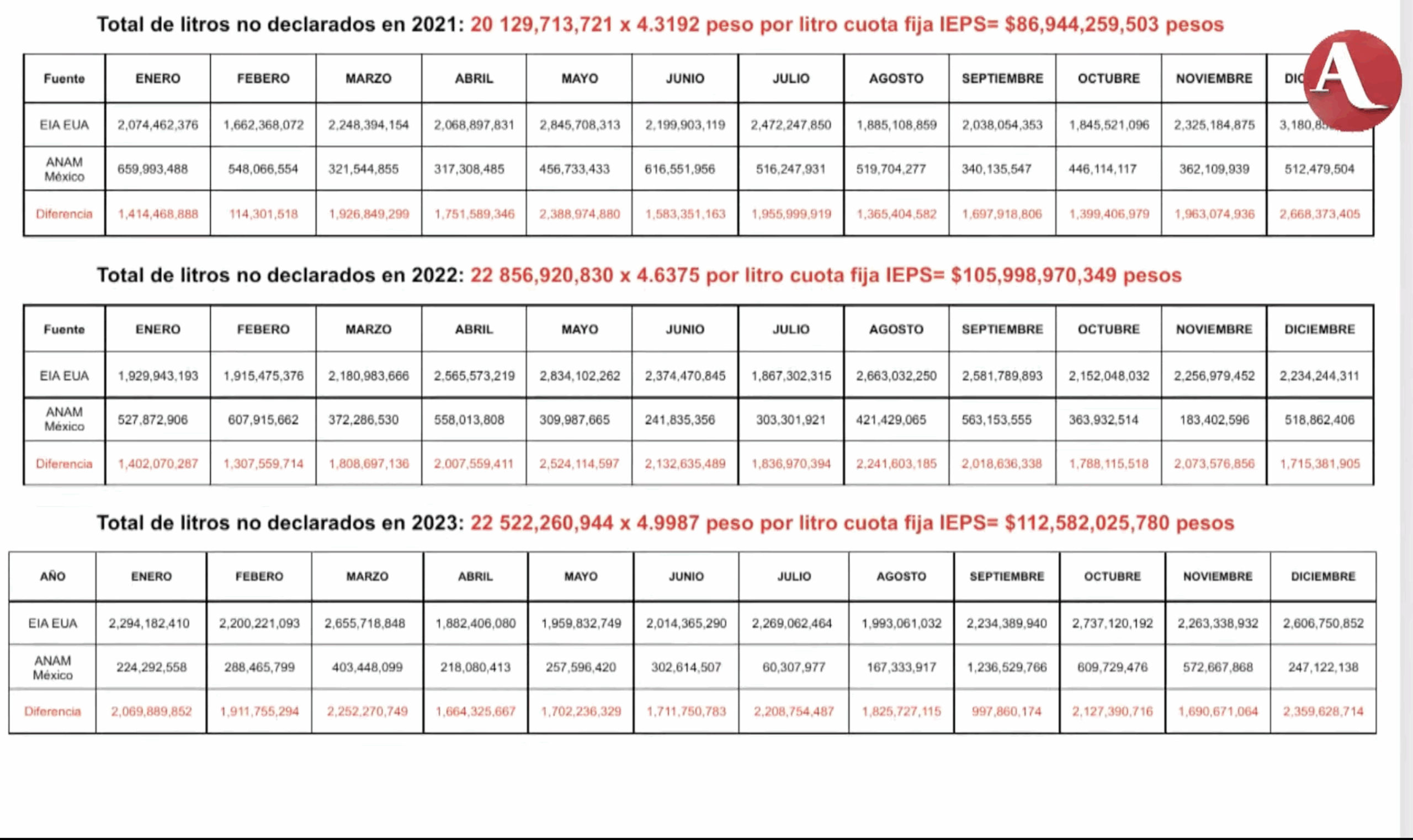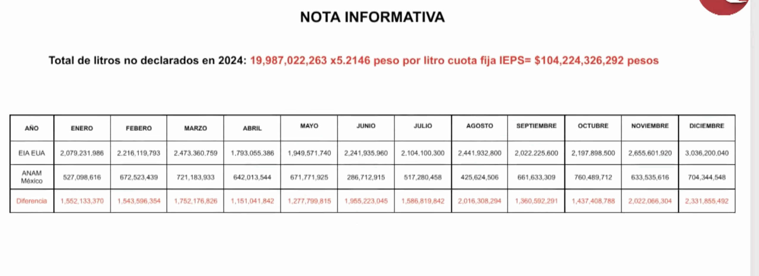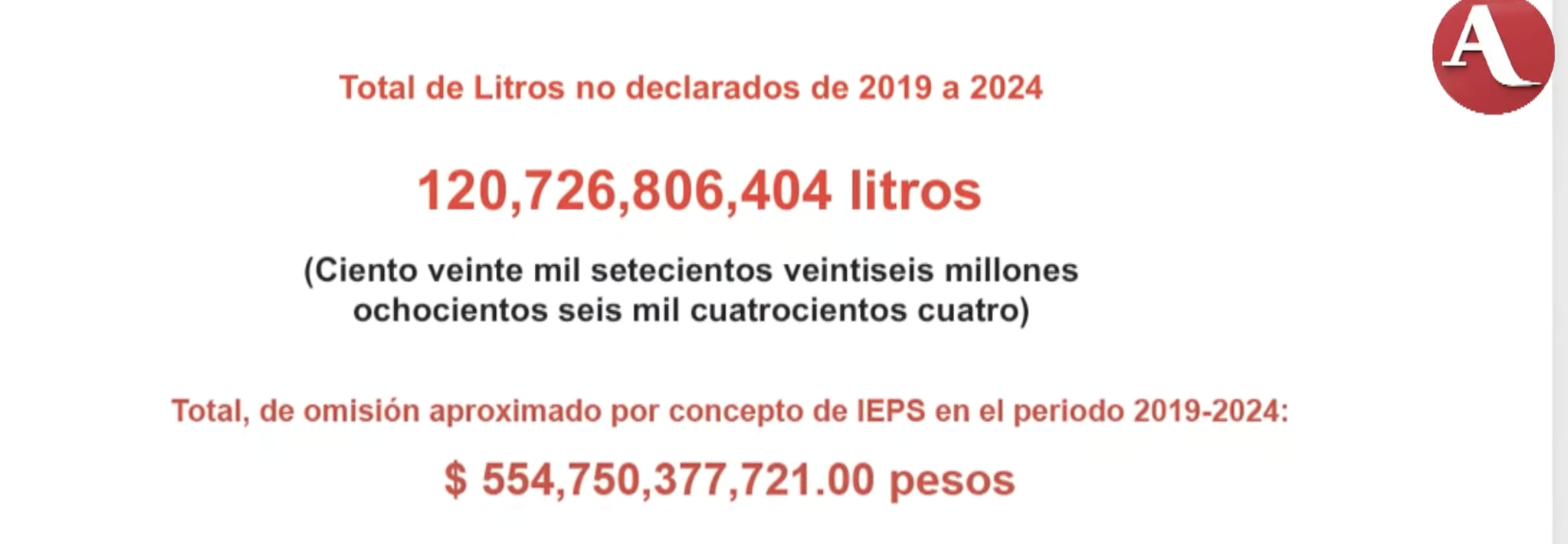 Las cifras, que van de 2019 a 2024, revela que a México no llegaron 120 mil millones de litros del combustible, lo que significó una pérdida por concepto de IEPS de 554 mil 700 millones de pesos, cifra cercana a la que diera a conocer la Procuradora Fiscal en la Cámara de Diputados un día después.