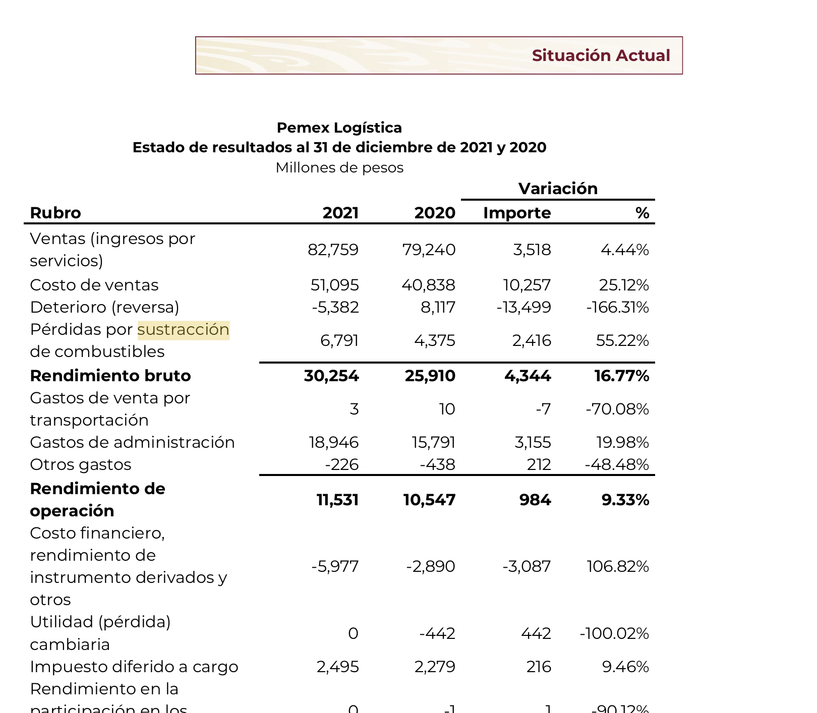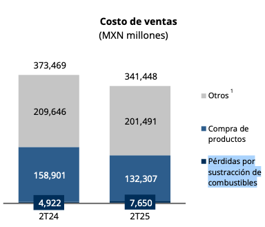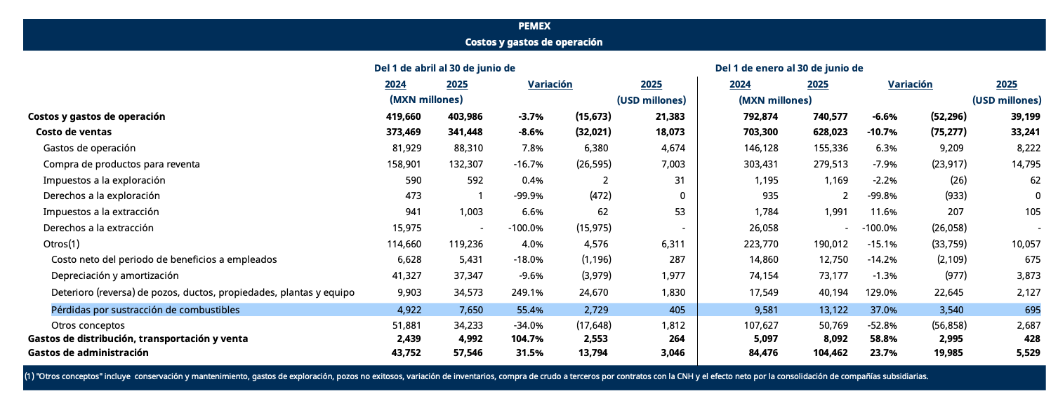 Y en otro informe más, hay más cifras. En “Resultados 2025 al segundo trimestre”, elaborado por la empresa, se da cuenta de la cantidad en pérdidas por “sustracción de combustibles”. La cifra reportada para el segundo trimestre es de 4 mil 922 millones de pesos y para el segundo trimestre de 2025 fue de 7 mil 650 millones de pesos.