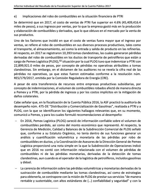 El problema con las cifras viene de tiempo atrás. Ya desde 2016, la Auditoría Superior de la Federación (ASF) había detectado en su revisión a Pemex que no existía información sobre el robo a combustible y que las pérdidas tampoco se habían contabilizado. Esto fue observado por la Auditoría, que en 2017 repitió otra auditoría a otra área comercializadora de Pemex y detectaron la misma deficiencia informativa.