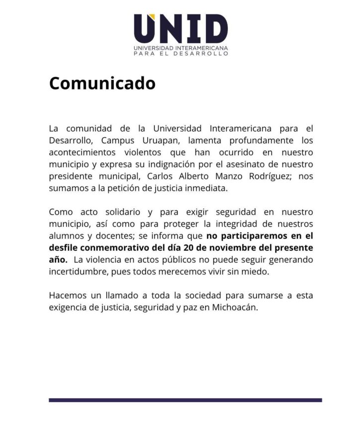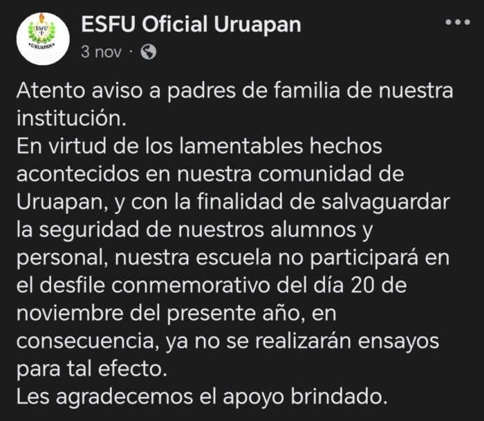 A ello se sumó la Escuela Secundaria Federal de Uruapan No. 1, que advirtió a padres de familia que “en virtud de los lamentables hechos acontecidos en nuestra comunidad de Uruapan, y con la finalidad de salvaguardar la seguridad de nuestros alumnos y personal, nuestra escuela no participará en el desfile conmemorativo del día 20 de noviembre”.