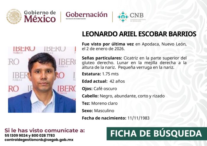 El profesor Leonardo Ariel Escobar Barrios de la Universidad Iberoamericana Puebla fue presuntamente detenido el pasado 31 de diciembre de 2025, y fue reportado desaparecido desde el pasado 2 de enero en Apodaca, Nuevo León.