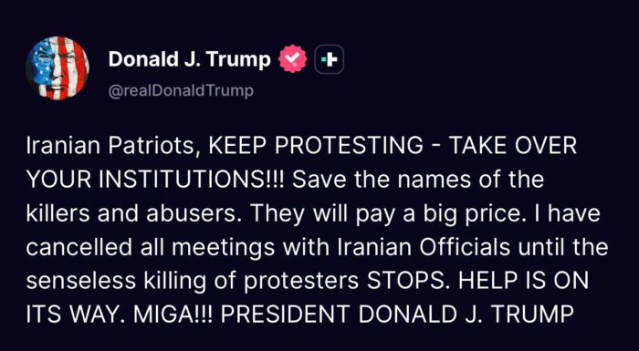 “Patriotas iraníes, ¡SIGAN PROTESTANDO, TOMEN EL CONTROL DE SUS INSTITUCIONES! Anoten los nombres de los asesinos y abusadores. Pagarán un alto precio. He cancelado todas las reuniones con funcionarios iraníes hasta que cese el asesinato sin sentido de manifestantes. LA AYUDA ESTÁ EN CAMINO. ¡MIGA! PRESIDENTE DONALD J. TRUMP”.