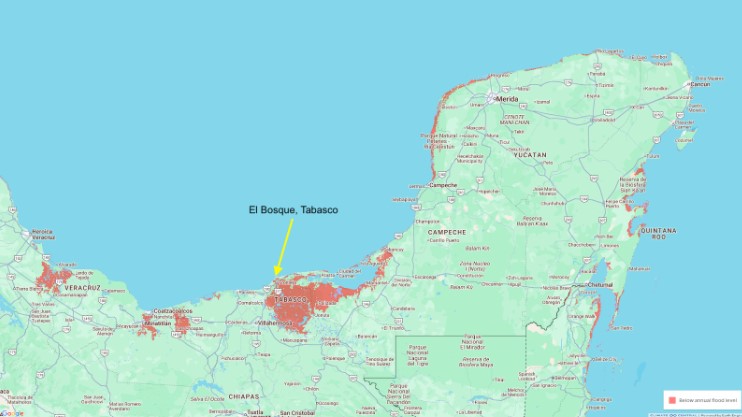 Figura 1. Escenario plausible de aumento del nivel del mar para 2050 bajo una trayectoria tendencial de calentamiento global. En rojo se muestran las zonas que podrían quedar parcial o totalmente sumergidas en el mar. La flecha amarilla indica la ubicación de la comunidad El Bosque, Tabasco (Fuente: https://coastal.climatecentral.org/).