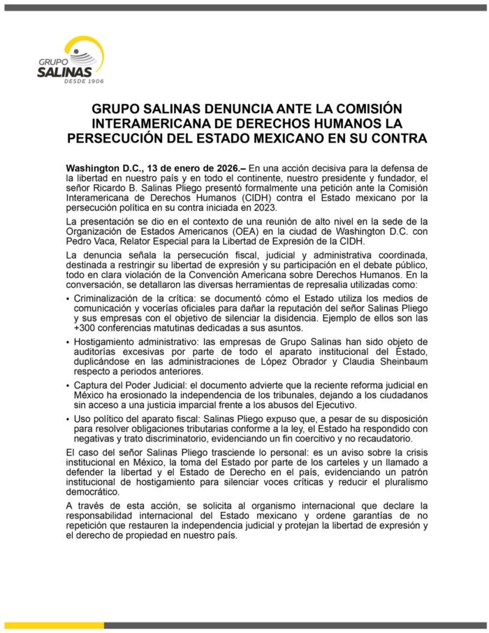 El consorcio empresarial Grupo Salinas informó que presentó una petición formal ante la Comisión Interamericana de Derechos Humanos (CIDH) en contra del Estado mexicano. La denuncia, encabezada por el presidente y fundador del grupo, Ricardo Salinas Pliego, acusa una estrategia de “persecución política” que habría iniciado en el año 2023.