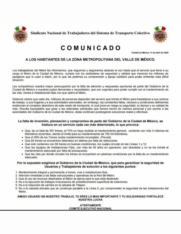 El Sindicato Nacional de Trabajadores del Sistema de Transporte Colectivo (SNTSTC) denunció que el Metro de la Ciudad de México opera sin mantenimiento adecuado ni presupuesto suficiente.