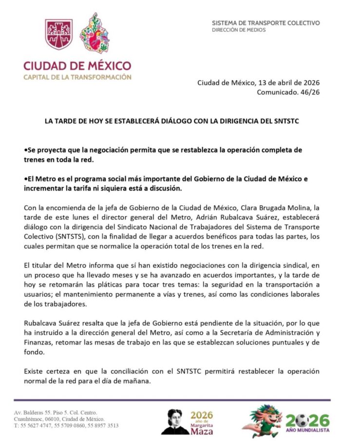 El gobierno de la Ciudad de México anunció que durante la tarde de hoy se establecerá contacto con la dirigencia del SNTSC para negociar y restablecer la operación completa de trenes en toda la red.