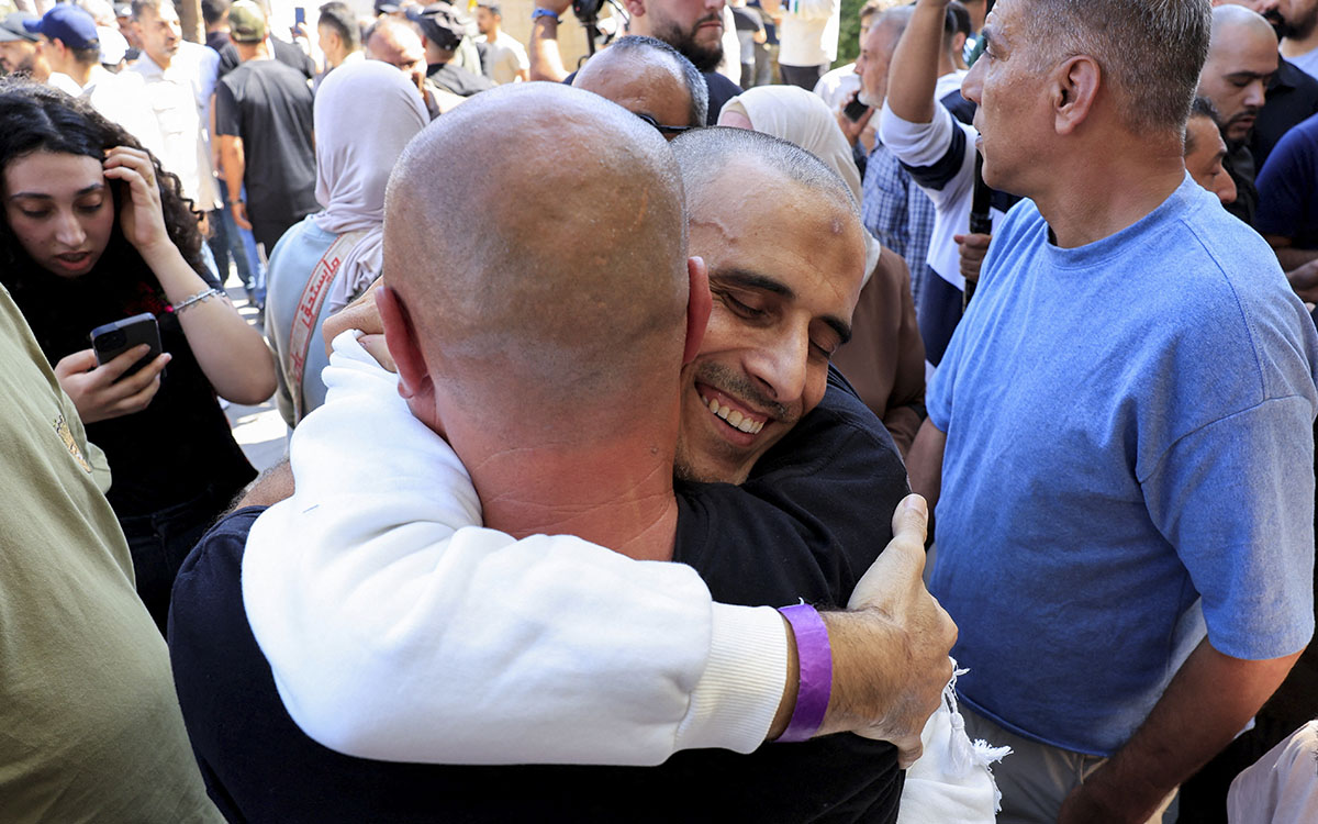 Los palestinos liberados portaban pañuelos palestinos y algunos aparecieron haciendo el signo de la victoria con las manos, antes de abrazar a sus seres queridos. Miembros de la Media Luna Roja les asistieron a su salida de los vehículos.
