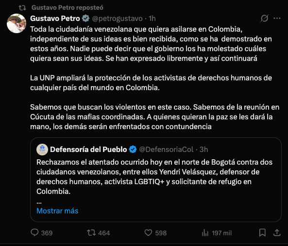 “Toda la ciudadanía venezolana que quiera asilarse en Colombia, independiente de sus ideas es bien recibida, como se ha demostrado en estos años”, escribió en X. “La (Unidad Nacional de Protección) UNP ampliará la protección de los activistas de derechos humanos de cualquier país del mundo en Colombia” (Reuters).
