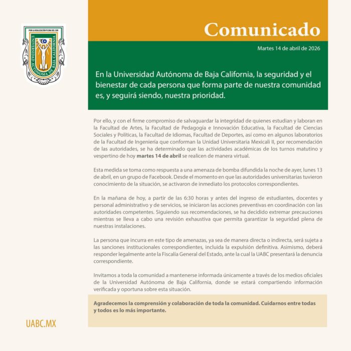 La Universidad Autónoma de Baja California (UABC) informó que las actividades académicas en la Unidad Universitaria Mexicali II se realizan este martes 14 de abril en modalidad virtual, tras la difusión de una amenaza de bomba en redes sociales, de acuerdo con un comunicado oficial.