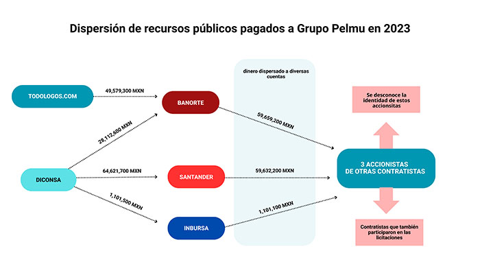 En total, Grupo Pelmu utilizó tres cuentas bancarias —en Santander, Banorte e Inbursa— para recibir 93,835,800 MXN de Diconsa y una transferencia adicional de 49,579,300 MXN de Todologos.com. De ese monto, transfirió el 99.8% a terceros, incluyendo a tres accionistas cuyos nombres no se revelan y que forman parte de otras empresas que también participaron en los mismos procedimientos de contratación.