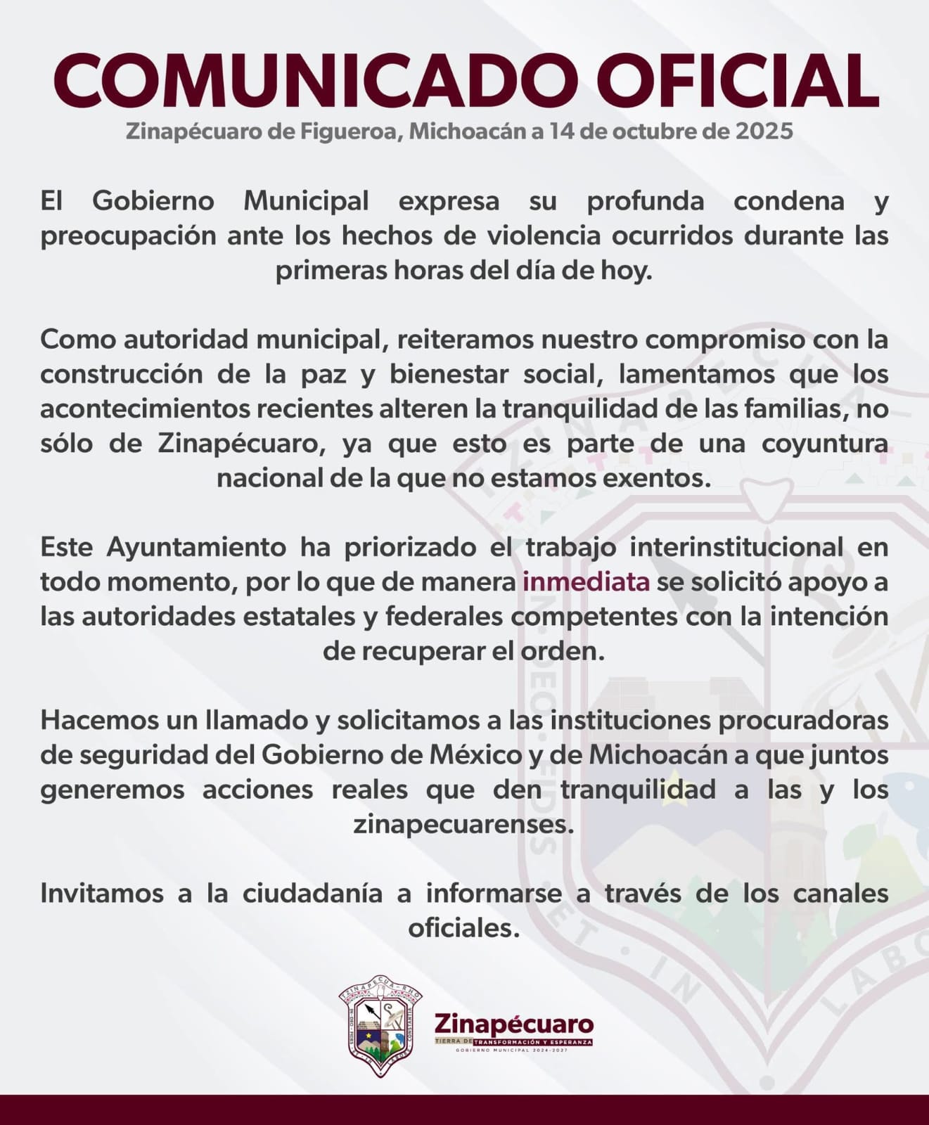 El Gobierno Municipal emitió un comunicado donde “expresa su profunda condena y preocupación ante los hechos de violencia”, y reconoció que estos acontecimientos “alteran la tranquilidad de las familias” no solo de Zinapécuaro, sino que forman parte de “una coyuntura nacional de la que no estamos exentos”.